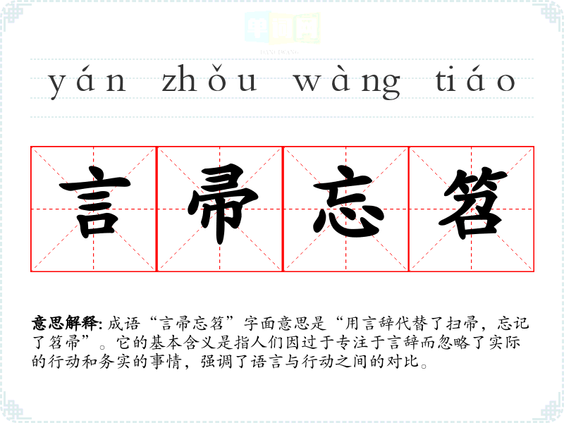 成语“言帚忘笤”字面意思是“用言辞代替了扫帚,忘记了笤帚”。它的基本含义是指人们因过于专注于言辞而忽略了实际的行动和务实的事情,强调了语言与行动之间的对比。