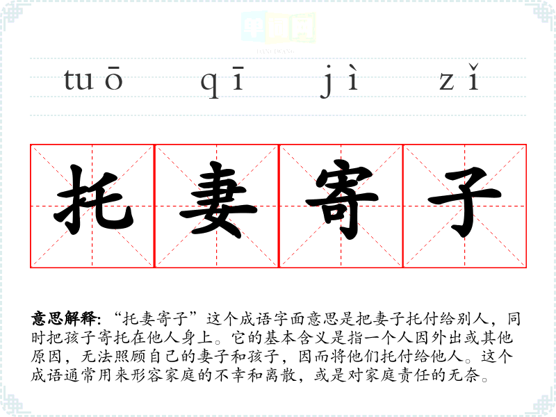 “托妻寄子”这个成语字面意思是把妻子托付给别人,同时把孩子寄托在他人身上。它的基本含义是指一个人因外出或其他原因,无法照顾自己的妻子和孩子,因而将他们托付给他人。这个成语通常用来形容家庭的不幸和离散,或是对家庭责任的无奈。