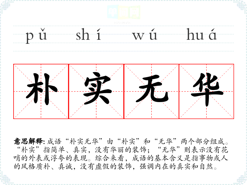 成语“朴实无华”由“朴实”和“无华”两个部分组成。“朴实”指简单、真实,没有华丽的装饰;“无华”则表示没有花哨的外表或浮夸的表现。综合来看,成语的基本含义是指事物或人的风格质朴、真诚,没有虚假的装饰,强调内在的真实和自然。