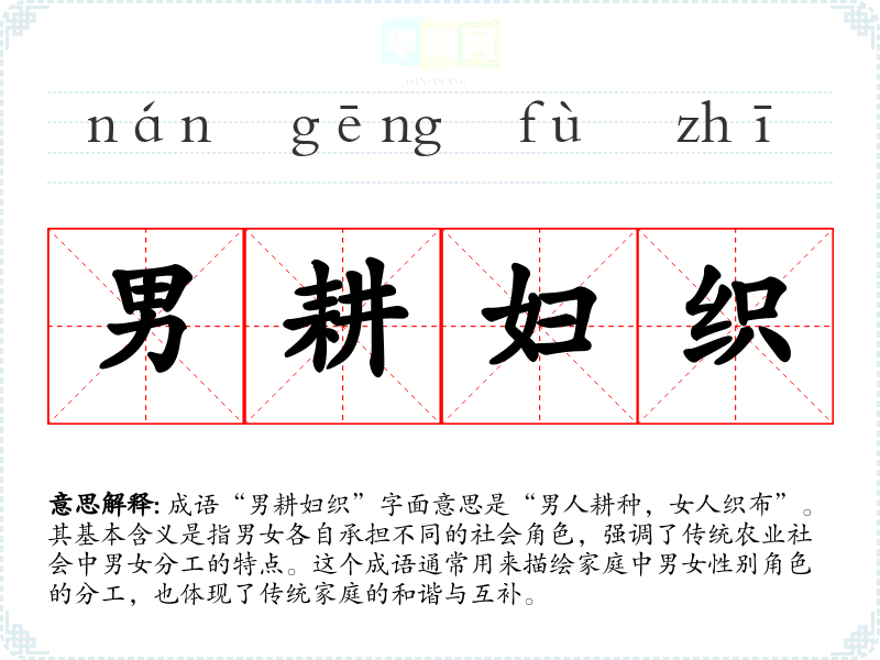 成语“男耕妇织”字面意思是“男人耕种,女人织布”。其基本含义是指男女各自承担不同的社会角色,强调了传统农业社会中男女分工的特点。这个成语通常用来描绘家庭中男女性别角色的分工,也体现了传统家庭的和谐与互补。