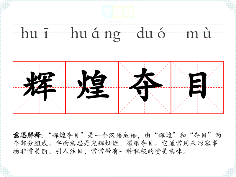 “辉煌夺目”是一个汉语成语,由“辉煌”和“夺目”两个部分组成。字面意思是光辉灿烂、耀眼夺目。它通常用来形容事物非常美丽、引人注目,常常带有一种积极的赞美意味。
