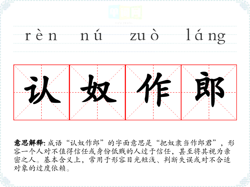 成语“认奴作郎”的字面意思是“把奴隶当作郎君”,形容一个人对不值得信任或身份低贱的人过于信任,甚至将其视为亲密之人。基本含义上,常用于形容目光短浅、判断失误或对不合适对象的过度依赖。