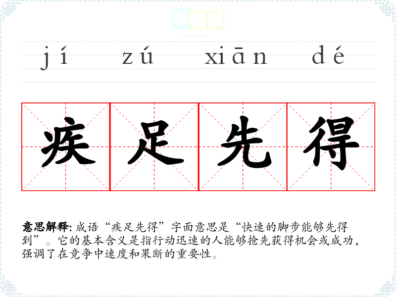 成语“疾足先得”字面意思是“快速的脚步能够先得到”。它的基本含义是指行动迅速的人能够抢先获得机会或成功,强调了在竞争中速度和果断的重要性。