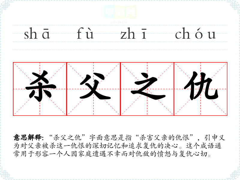 “杀父之仇”字面意思是指“杀害父亲的仇恨”,引申义为对父亲被杀这一仇恨的深切记忆和追求复仇的决心。这个成语通常用于形容一个人因家庭遭遇不幸而对仇敌的愤怒与复仇心切。