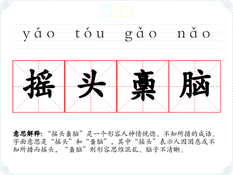 “摇头稾脑”是一个形容人神情恍惚、不知所措的成语。字面意思是“摇头”和“稾脑”,其中“摇头”表示人因困惑或不知所措而摇头,“稾脑”则形容思维混乱、脑子不清晰。