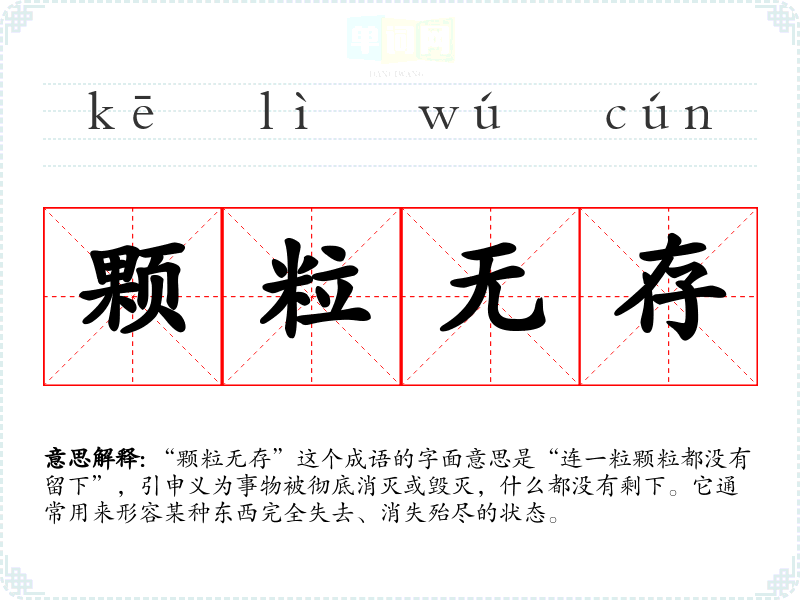 “颗粒无存”这个成语的字面意思是“连一粒颗粒都没有留下”,引申义为事物被彻底消灭或毁灭,什么都没有剩下。它通常用来形容某种东西完全失去、消失殆尽的状态。