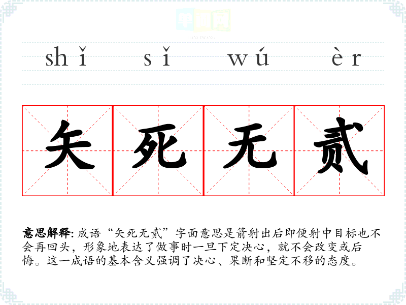 成语“矢死无贰”字面意思是箭射出后即便射中目标也不会再回头,形象地表达了做事时一旦下定决心,就不会改变或后悔。这一成语的基本含义强调了决心、果断和坚定不移的态度。