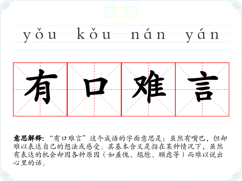 “有口难言”这个成语的字面意思是:虽然有嘴巴,但却难以表达自己的想法或感受。其基本含义是指在某种情况下,虽然有表达的机会却因各种原因(如羞愧、尴尬、顾虑等)而难以说出心里的话。