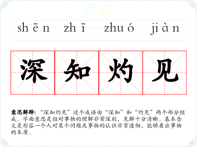 “深知灼见”这个成语由“深知”和“灼见”两个部分组成。字面意思是指对事物的理解非常深刻,见解十分清晰。基本含义是形容一个人对某个问题或事物的认识非常透彻,能够看出事物的本质。