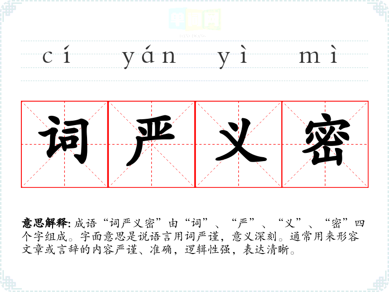 成语“词严义密”由“词”、“严”、“义”、“密”四个字组成。字面意思是说语言用词严谨,意义深刻。通常用来形容文章或言辞的内容严谨、准确,逻辑性强,表达清晰。