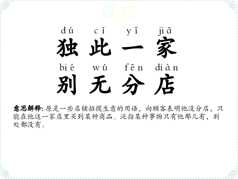 | 只此一家,别无分店 | 原是一些店铺招揽生意的用语,向顾客表明他没分店,只能在他这一家店里买到某种商品。泛指某种事物独一无二或独自垄断。 |