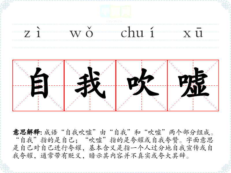 成语“自我吹嘘”由“自我”和“吹嘘”两个部分组成。“自我”指的是自己;“吹嘘”指的是夸耀或自我夸赞。字面意思是自己对自己进行夸耀,基本含义是指一个人过分地自我宣传或自我夸耀,通常带有贬义,暗示其内容并不真实或夸大其辞。