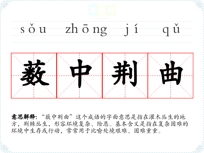 “薮中荆曲”这个成语的字面意思是指在灌木丛生的地方,荆棘丛生,形容环境复杂、险恶。基本含义是指在复杂困难的环境中生存或行动,常常用于比喻处境艰难、困难重重。