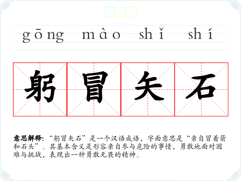 “躬冒矢石”是一个汉语成语,字面意思是“亲自冒着箭和石头”。其基本含义是形容亲自参与危险的事情,勇敢地面对困难与挑战,表现出一种勇敢无畏的精神。