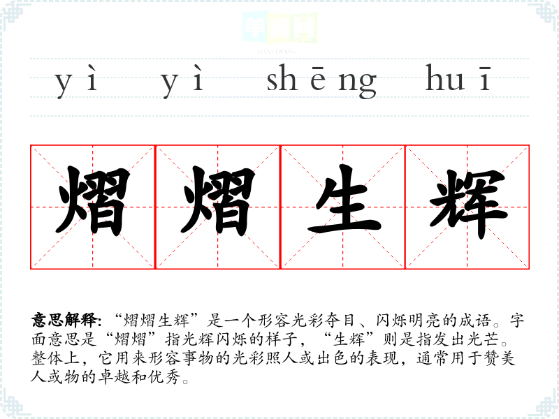 | 熠熠生辉 | 熠熠:光耀,鲜明。形容光彩闪耀的样子。 |