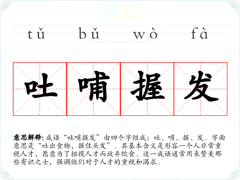 成语“吐哺握发”由四个字组成:吐、哺、握、发。字面意思是“吐出食物,握住头发”。其基本含义是形容一个人非常重视人才,愿意为了招揽人才而放弃饮食。这一成语通常用来赞美那些有识之士,强调他们对于人才的重视和渴求。
