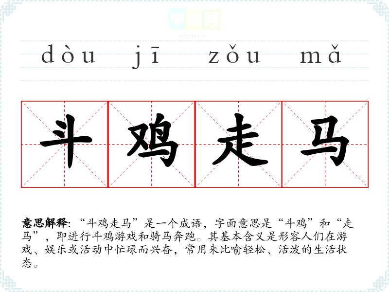 “斗鸡走马”是一个成语,字面意思是“斗鸡”和“走马”,即进行斗鸡游戏和骑马奔跑。其基本含义是形容人们在游戏、娱乐或活动中忙碌而兴奋,常用来比喻轻松、活泼的生活状态。
