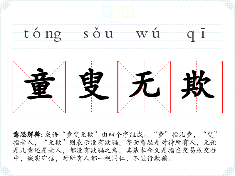 | 童叟无欺 | 童:未成年的孩子;叟:年老的男人;欺:蒙骗。既不欺骗小孩也不欺骗老人。指买卖公平。 |