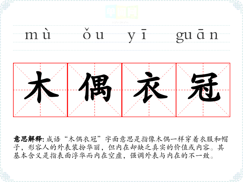 成语“木偶衣冠”字面意思是指像木偶一样穿着衣服和帽子,形容人的外表装扮华丽,但内在却缺乏真实的价值或内容。其基本含义是指表面浮华而内在空虚,强调外表与内在的不一致。