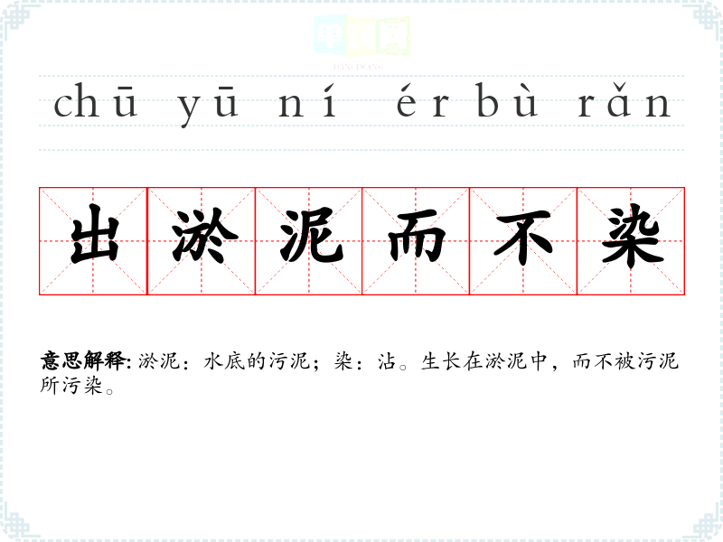 | 出淤泥而不染 | 淤泥:水底的污泥;染:沾。生长在淤泥中,而不被污泥所污染。 |