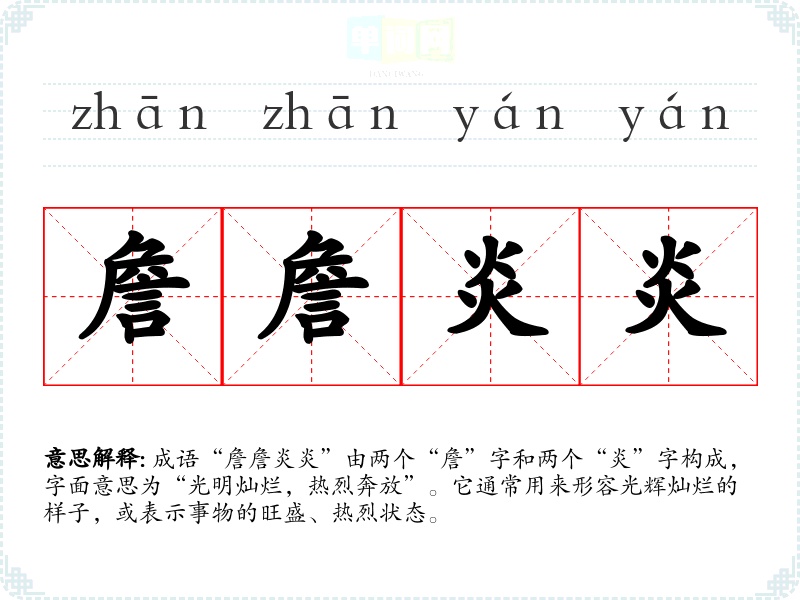 成语“詹詹炎炎”由两个“詹”字和两个“炎”字构成,字面意思为“光明灿烂,热烈奔放”。它通常用来形容光辉灿烂的样子,或表示事物的旺盛、热烈状态。