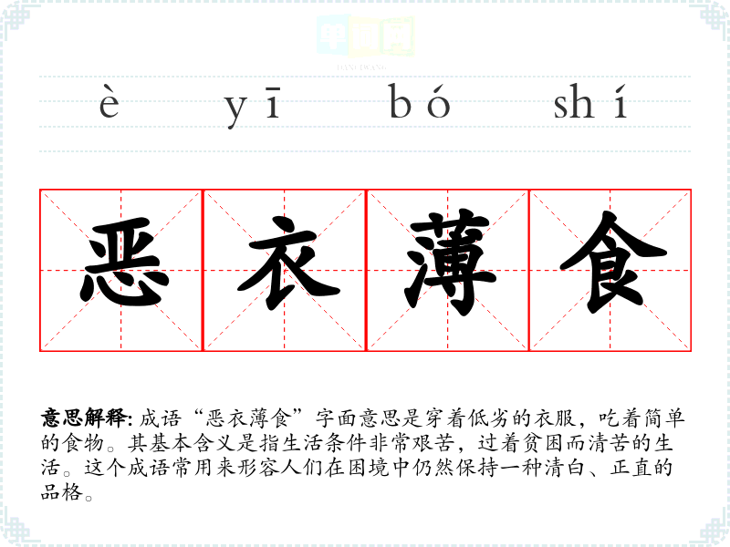 成语“恶衣*食”字面意思是穿着低劣的衣服,吃着简单的食物。其基本含义是指生活条件非常艰苦,过着贫困而清苦的生活。这个成语常用来形容人们在困境中仍然保持一种清白、正直的品格。