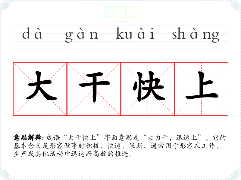 成语“大干快上”字面意思是“大力干,迅速上”。它的基本含义是形容做事时积极、快速、果断,通常用于形容在工作、生产或其他活动中迅速而高效的推进。
