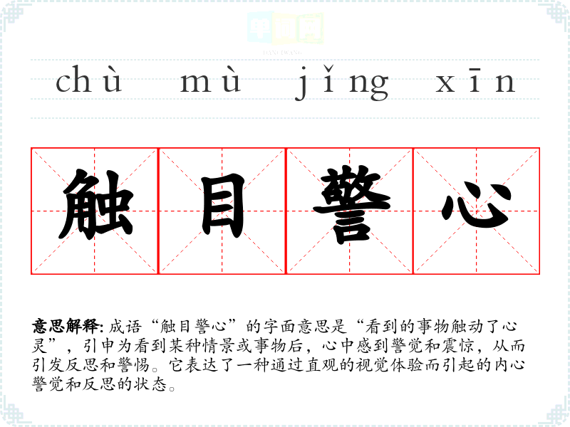 成语“触目警心”的字面意思是“看到的事物触动了心灵”,引申为看到某种情景或事物后,心中感到警觉和震惊,从而引发反思和警惕。它表达了一种通过直观的视觉体验而引起的内心警觉和反思的状态。