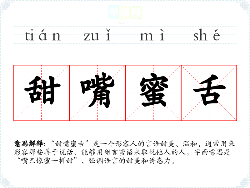 “甜嘴蜜舌”是一个形容人的言语甜美、温和,通常用来形容那些善于说话、能够用甜言蜜语来取悦他人的人。字面意思是“嘴巴像蜜一样甜”,强调语言的甜美和诱惑力。