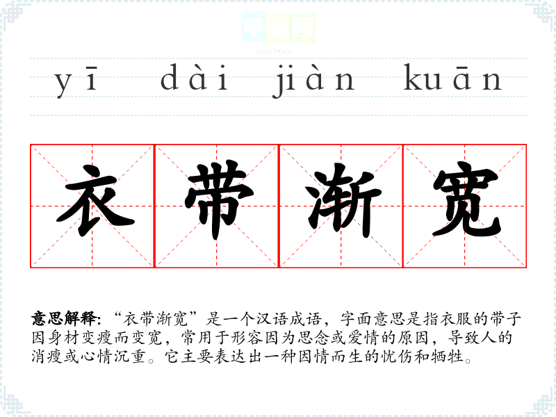 “衣带渐宽”常用在描述因情感、思念而导致的情绪变化,适用于文学作品、情感表达、日常对话等场景。例如,在情感文学中,作家可能用这个成语来形容主人公因失去爱情而逐渐消瘦的状态;在日常对话中,人们用来形容自己或他人因思念某人而心情沉重。