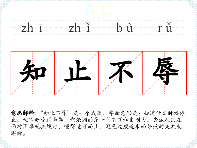 “知止不辱”是一个成语,字面意思是:知道什么时候停止,就不会受到羞辱。它强调的是一种智慧和自制力,告诫人们在面对困难或挑战时,懂得适可而止,避免过度追求而导致的失败或尴尬。