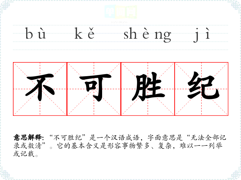 “不可胜纪”是一个汉语成语,字面意思是“无法全部记录或数清”。它的基本含义是形容事物繁多、复杂,难以一一列举或记载。