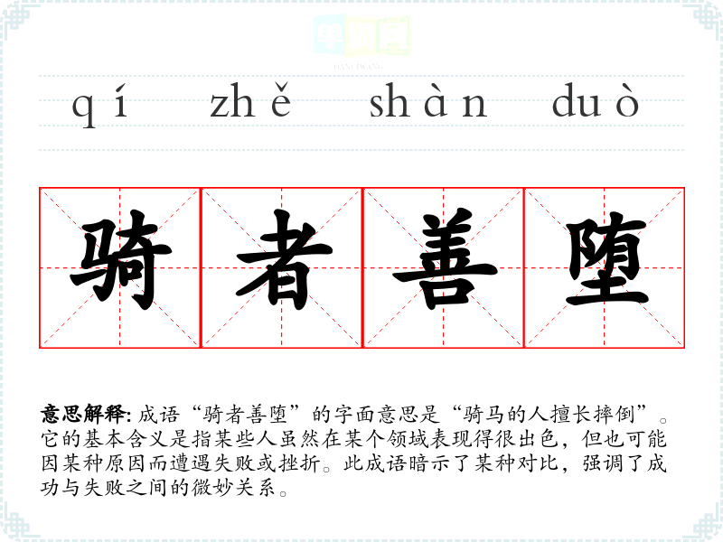 成语“骑者善堕”的字面意思是“骑马的人擅长摔倒”。它的基本含义是指某些人虽然在某个领域表现得很出色,但也可能因某种原因而遭遇失败或挫折。此成语暗示了某种对比,强调了成功与失败之间的微妙关系。