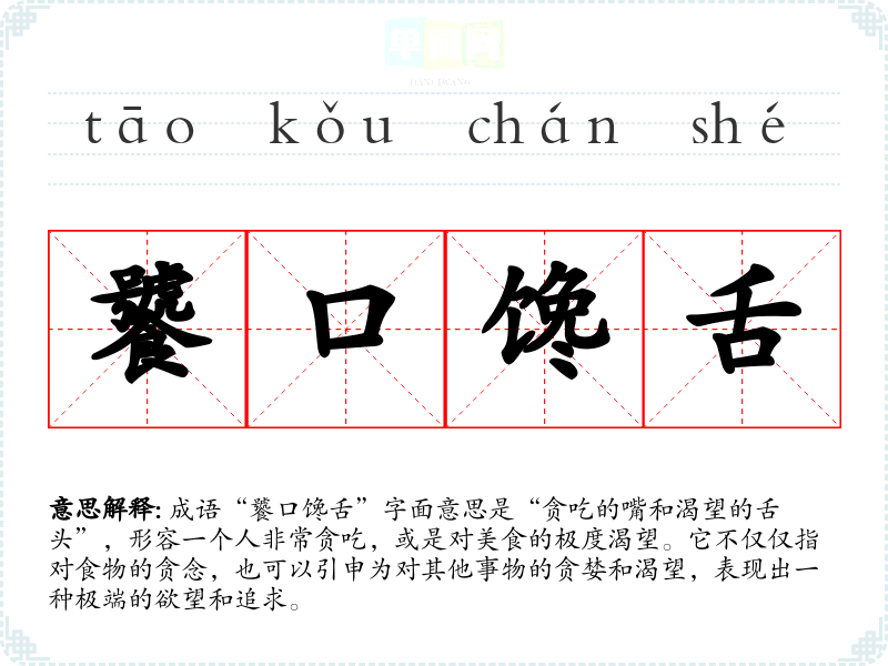 - 日常对话:在朋友聚会时,如果有人吃得特别多,可以用“饕口馋舌”来调侃。