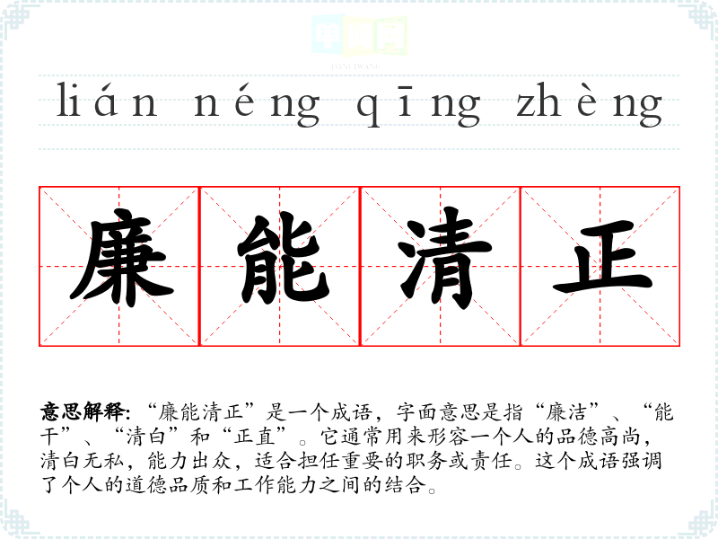 “廉能清正”是一个成语,字面意思是指“廉洁”、“能干”、“清白”和“正直”。它通常用来形容一个人的品德高尚,清白无私,能力出众,适合担任重要的职务或责任。这个成语强调了个人的道德品质和工作能力之间的结合。