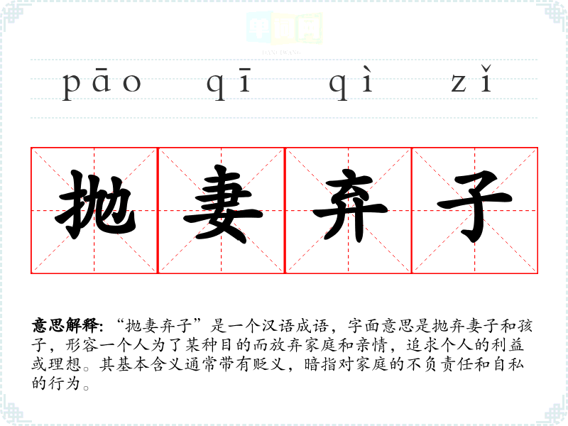 “抛妻弃子”是一个汉语成语,字面意思是抛弃妻子和孩子,形容一个人为了某种目的而放弃家庭和亲情,追求个人的利益或理想。其基本含义通常带有贬义,暗指对家庭的不负责任和自私的行为。