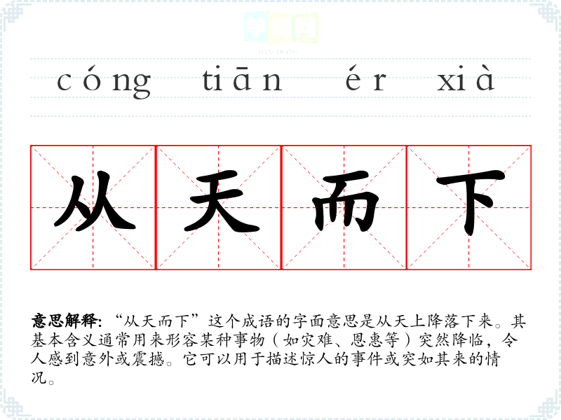 在传统文化中,天被视为至高无上的权威,代表着命运和神灵的意志。因此,“从天而下”往往带有一种神秘感,给人一种不可抗拒的感觉。在现代社会,这个成语的应用可以延伸至描述突发的社会、经济危机等,反映出人们对不可预知未来的焦虑和无奈。
