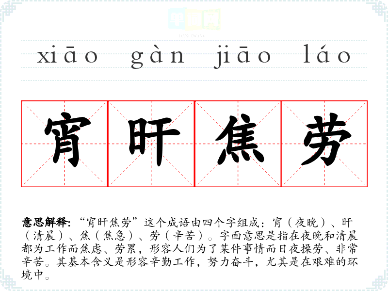 “宵旰焦劳”这个成语由四个字组成:宵(夜晚)、旰(清晨)、焦(焦急)、劳(辛苦)。字面意思是指在夜晚和清晨都为工作而焦虑、劳累,形容人们为了某件事情而日夜操劳、非常辛苦。其基本含义是形容辛勤工作,努力奋斗,尤其是在艰难的环境中。