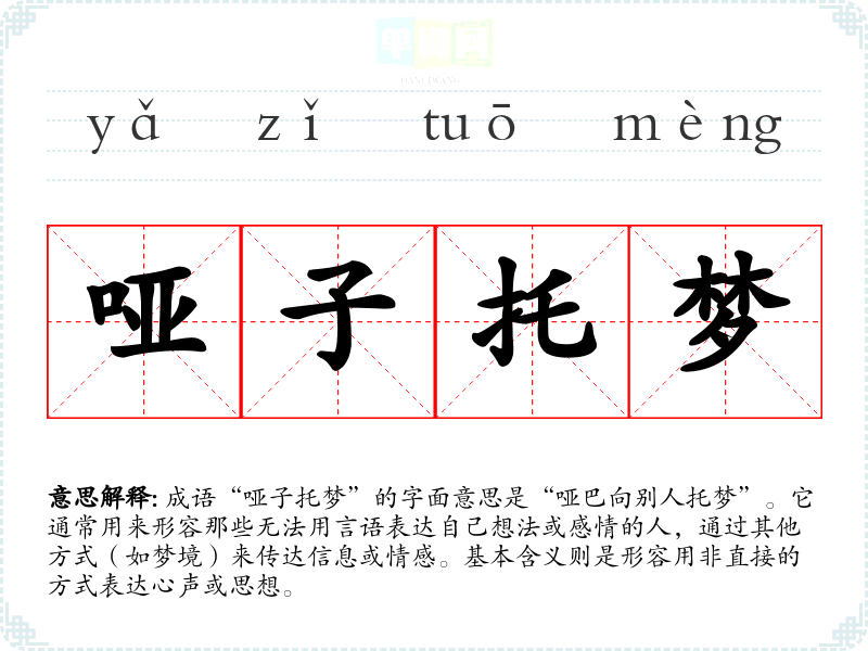 成语“哑子托梦”的字面意思是“哑巴向别人托梦”。它通常用来形容那些无法用言语表达自己想法或感情的人,通过其他方式(如梦境)来传达信息或情感。基本含义则是形容用非直接的方式表达心声或思想。