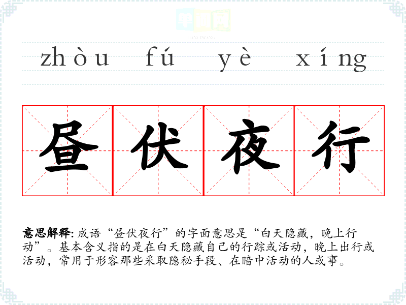 成语“昼伏夜行”的字面意思是“白天隐藏,晚上行动”。基本含义指的是在白天隐藏自己的行踪或活动,晚上出行或活动,常用于形容那些采取隐秘手段、在暗中活动的人或事。