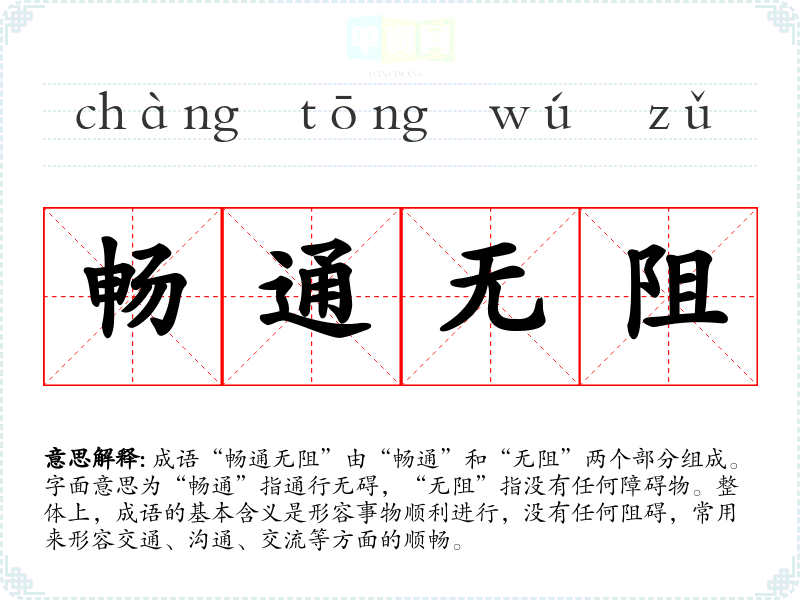 成语“畅通无阻”由“畅通”和“无阻”两个部分组成。字面意思为“畅通”指通行无碍,“无阻”指没有任何障碍物。整体上,成语的基本含义是形容事物顺利进行,没有任何阻碍,常用来形容交通、沟通、交流等方面的顺畅。