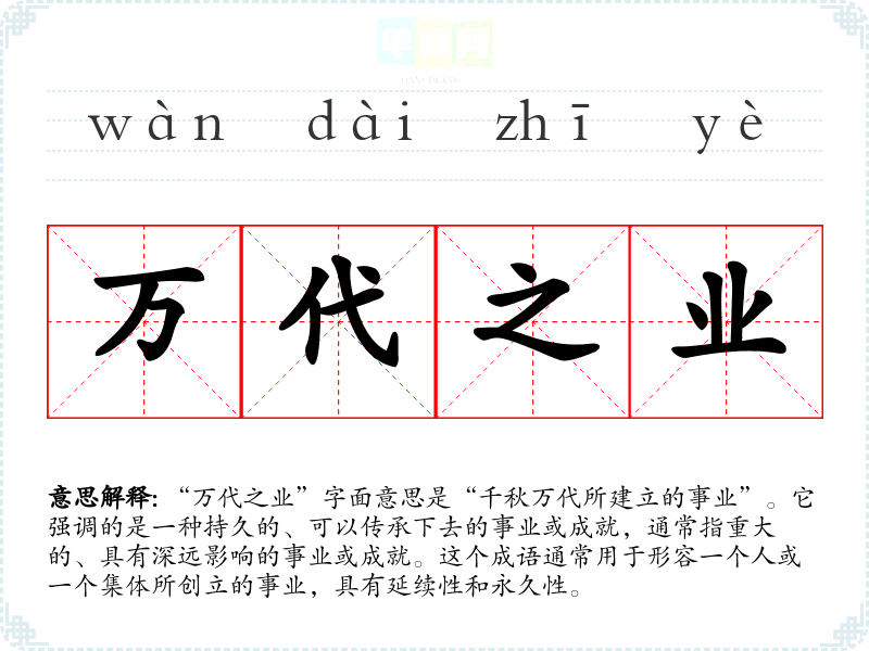 “万代之业”字面意思是“千秋万代所建立的事业”。它强调的是一种持久的、可以传承下去的事业或成就,通常指重大的、具有深远影响的事业或成就。这个成语通常用于形容一个人或一个集体所创立的事业,具有延续性和永久性。