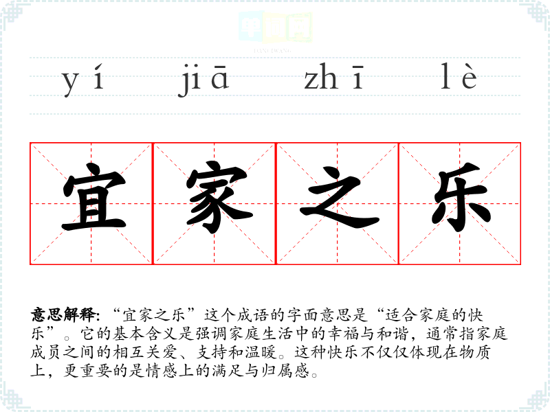 “宜家之乐”这个成语的字面意思是“适合家庭的快乐”。它的基本含义是强调家庭生活中的幸福与和谐,通常指家庭成员之间的相互关爱、支持和温暖。这种快乐不仅仅体现在物质上,更重要的是情感上的满足与归属感。
