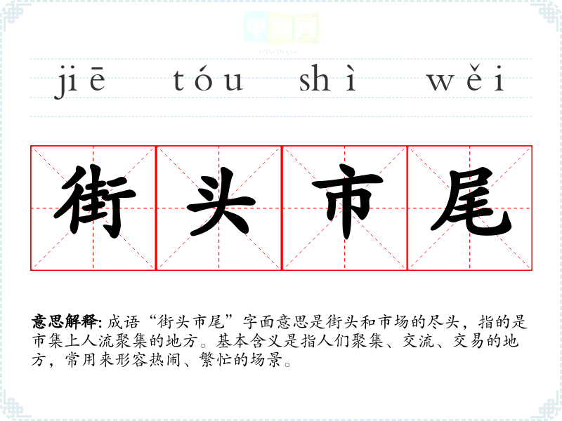 成语“街头市尾”字面意思是街头和市场的尽头,指的是市集上人流聚集的地方。基本含义是指人们聚集、交流、交易的地方,常用来形容热闹、繁忙的场景。