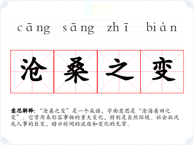 “沧桑之变”是一个成语,字面意思是“沧海桑田之变”。它常用来形容事物的重大变化,特别是自然环境、社会状况或人事的巨变,暗示时间的流逝和变化的无常。