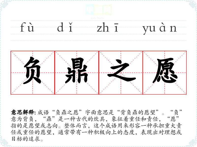 成语“负鼎之愿”字面意思是“背负鼎的愿望”。“负”意为背负,“鼎”是一种古代的炊具,象征着重任和责任,“愿”指的是愿望或志向。整体而言,这个成语用来形容一种承担重大责任或重任的愿望,通常带有一种积极向上的态度,表现出对理想或目标的追求。