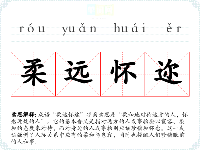 成语“柔远怀迩”字面意思是“柔和地对待远方的人,怀念近处的人”。它的基本含义是指对远方的人或事物要以宽容、柔和的态度来对待,而对身边的人或事物则应该珍惜和怀念。这一成语强调了人际关系中应有的柔和与包容,同时也提醒人们珍惜眼前的人和事。