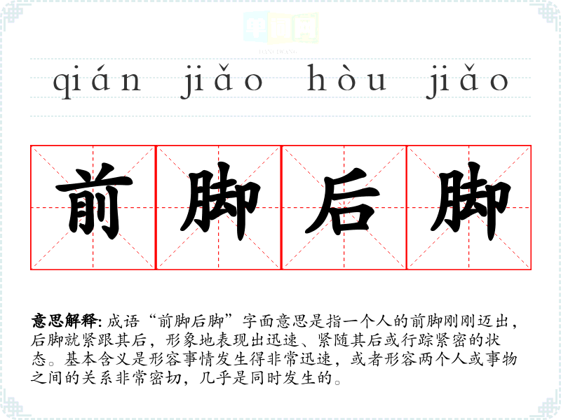 成语“前脚后脚”字面意思是指一个人的前脚刚刚迈出,后脚就紧跟其后,形象地表现出迅速、紧随其后或行踪紧密的状态。基本含义是形容事情发生得非常迅速,或者形容两个人或事物之间的关系非常密切,几乎是同时发生的。