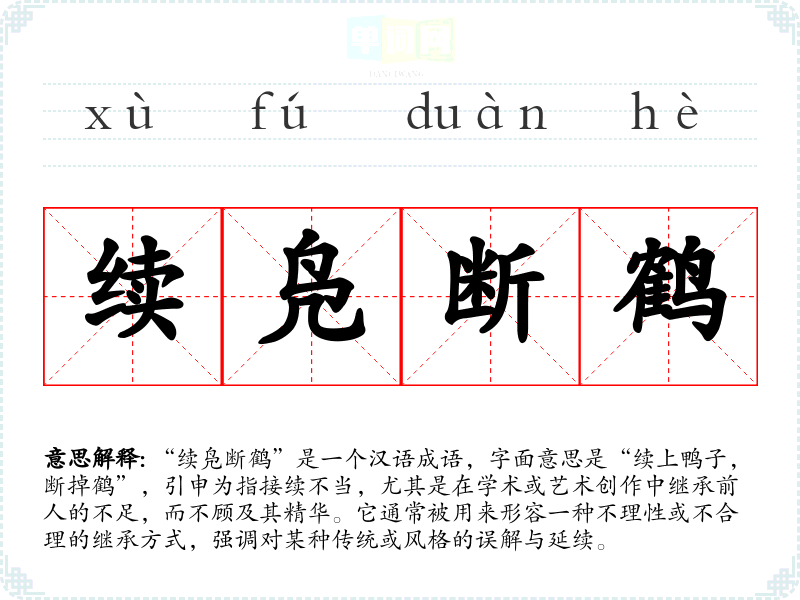 - 反义成语: “推陈出新”——强调在继承中创新,与“续凫断鹤”形成鲜明对比。