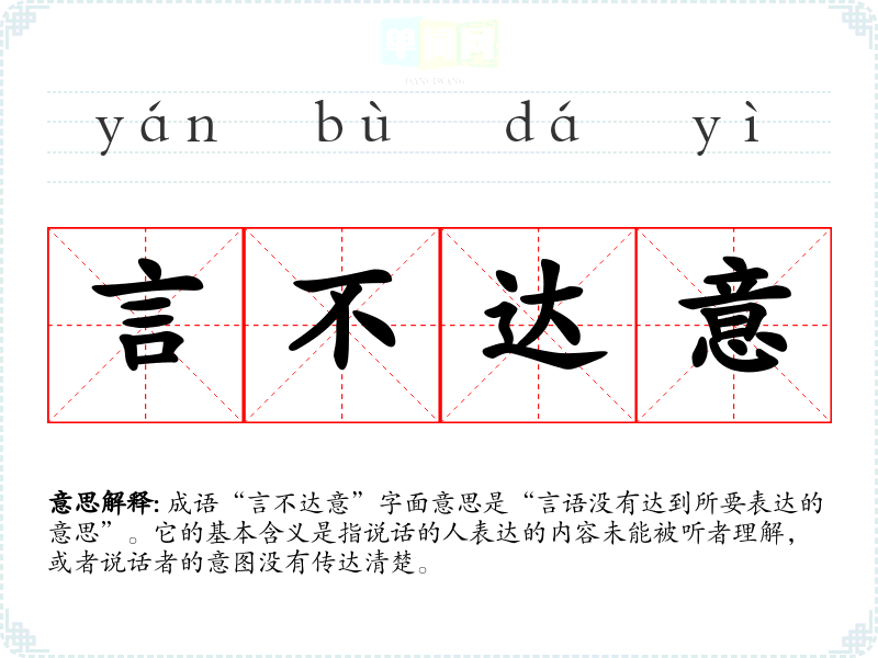 成语“言不达意”字面意思是“言语没有达到所要表达的意思”。它的基本含义是指说话的人表达的内容未能被听者理解,或者说话者的意图没有传达清楚。
